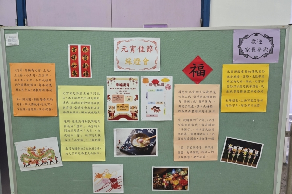 由輔導組、中文學會、家政科、家教會合辦的「幸福元宵」活動已於一片熱鬧歡笑聲中完成。大家一起動動手製作中國傳統手工、猜猜燈謎、看看製作湯圓示範,並品嚐傳統湯圓、龍鬚糖及糖蔥餅;老師、家長、學生一同認識中華文化,歡度佳節,一樂也。