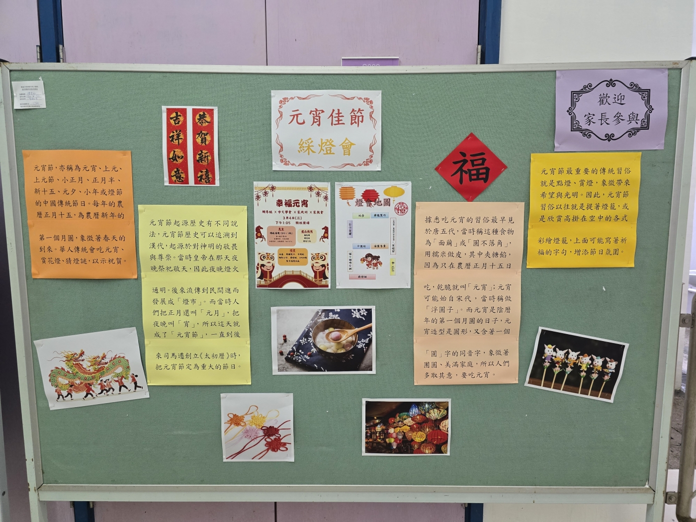 由輔導組、中文學會、家政科、家教會合辦的「幸福元宵」活動已於一片熱鬧歡笑聲中完成。大家一起動動手製作中國傳統手工、猜猜燈謎、看看製作湯圓示範,並品嚐傳統湯圓、龍鬚糖及糖蔥餅;老師、家長、學生一同認識中華文化,歡度佳節,一樂也。
